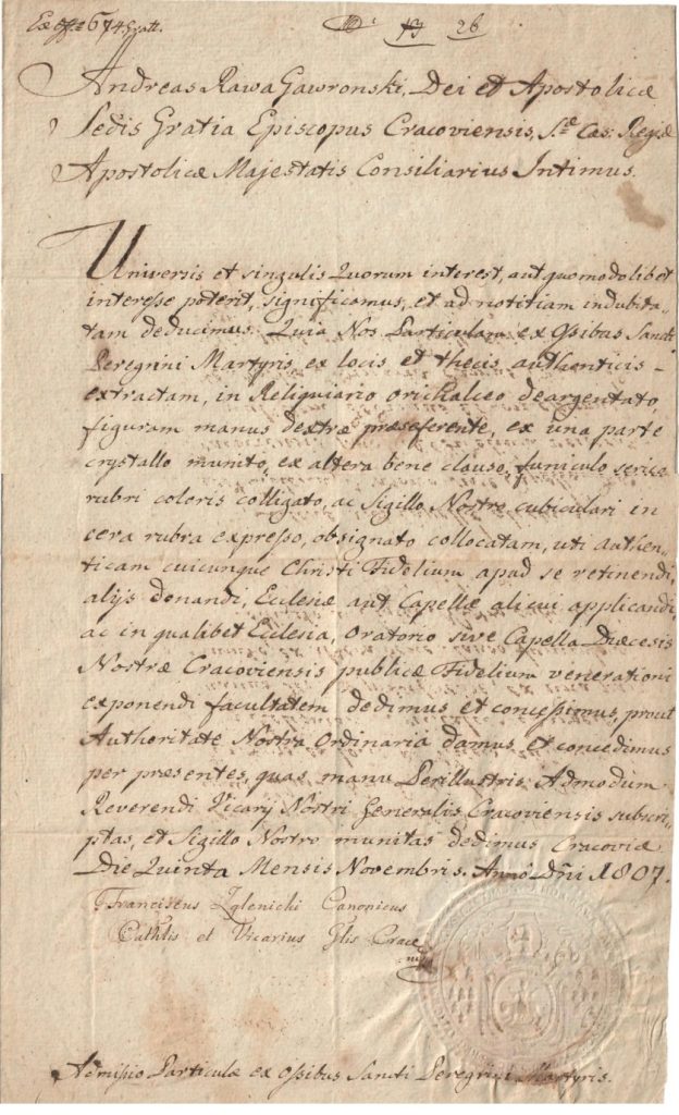 Wszystkim zainteresowanym lub zainteresowanym w jakikolwiek sposób przekazujemy i podajemy do waszej niewątpliwej wiadomości następujące szczegóły dotyczące kości świętego męczennika Peregryna, wydobytych z autentycznych miejsc i szkatuł, umieszczonych w relikwiarzu z orichalcum* posrebrzanym z figurką prawej ręki, chronionym z jednej strony kryształem, z drugiej strony szczelnie zamkniętym, przewiązanym czerwonym jedwabnym sznurem, z Naszą sześcienną Pieczęcią z czerwonego wosku, zapieczętowaną jako autentyczne upoważnienie do przechowywania u każdego z Wiernych Chrystusa, przekazywania darowizn innym, składania w kościele lub kaplicy innej osoby oraz umieszczania w dowolnym kościele, kaplicy lub kaplicy naszej Diecezji Krakowskiej dla publicznej czci Wiernych, tak jak dajemy i poczynamy z Naszą Zwyczajną Władzą za pośrednictwem podmiotów, które podpisaliśmy ręką Naszego Najjaśniejszego Najczcigodniejszego Wikariusza Generalnego Krakowa i zabezpieczyliśmy Naszą Pieczęcią, przekazaliśmy Krakowowi. Piętnastego dnia listopada. W Roku Pańskim 1807