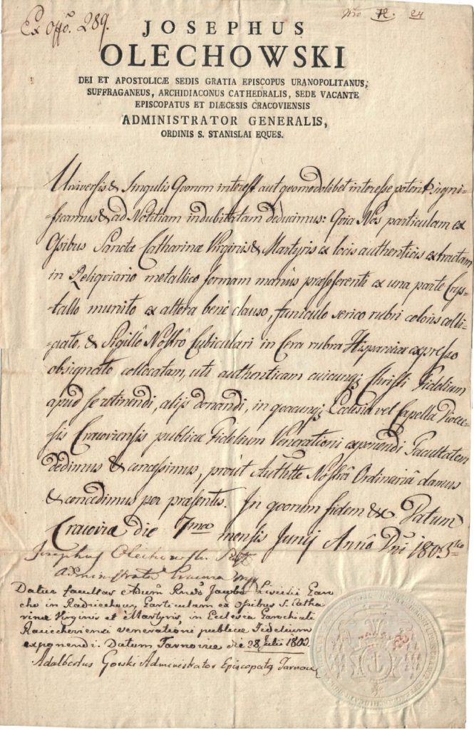 Nadanie udzielone Najjaśniejszemu i Najczcigodniejszemu ks. Jakubowi Lisińskiemu z Parafii w Radziechowicach (!), na wystawienie części kości św. Katarzyny Dziewicy i Męczennicy w kościele parafialnym w Raciechowicach dla publicznej czci wiernych. Datowane z Tarnowa, 28 lipca 1803 r. Wojciech Górski, administrator biskupstwa tarnowskiego