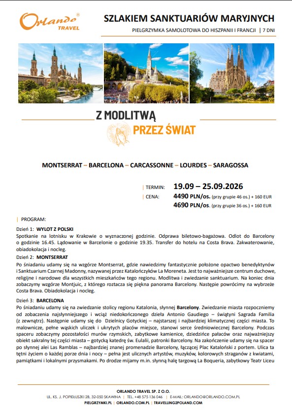 O wspaniały Apostole, Święty Jakubie, który przez przyczynę twojego gorącego i hojnego serca byłeś wybrany przez Pana Jezusa, aby być świadkiem Jego chwały na Górze Tabor i Jego agonii w Ogrodzie Oliwnym, wzbudź w tym niełatwym czasie dla ludzkości licznych i świętych głosicieli Dobrej Nowiny. Niech przyniosą współczesnemu światu gorący powiew żywej wiary, miłości i ufności w Boga, który jest Panem historii. Spraw, abyśmy gorliwiej poznawali i uwielbiali Jezusa Chrystusa, który jest Drogą, Prawdą i Życiem. Amen.